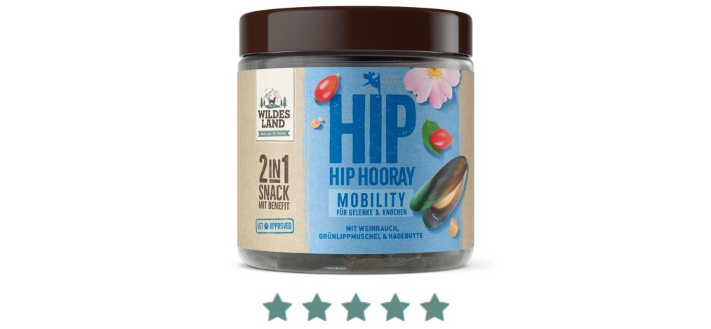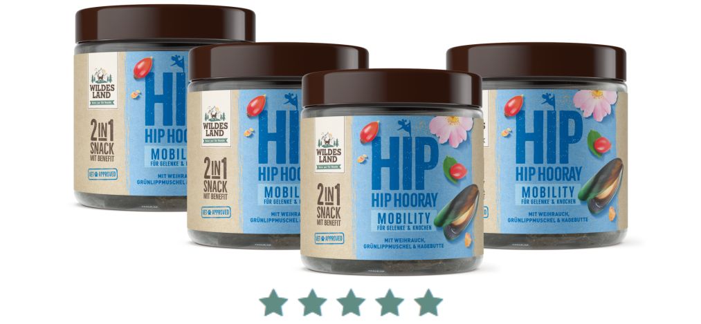 Mit dem natürlichen 2in1 Snack MOBILITY hilfst Du ihm, sich wieder frei und glücklich zu bewegen – entwickelt mit Tierärzten, geliebt von Hunden.