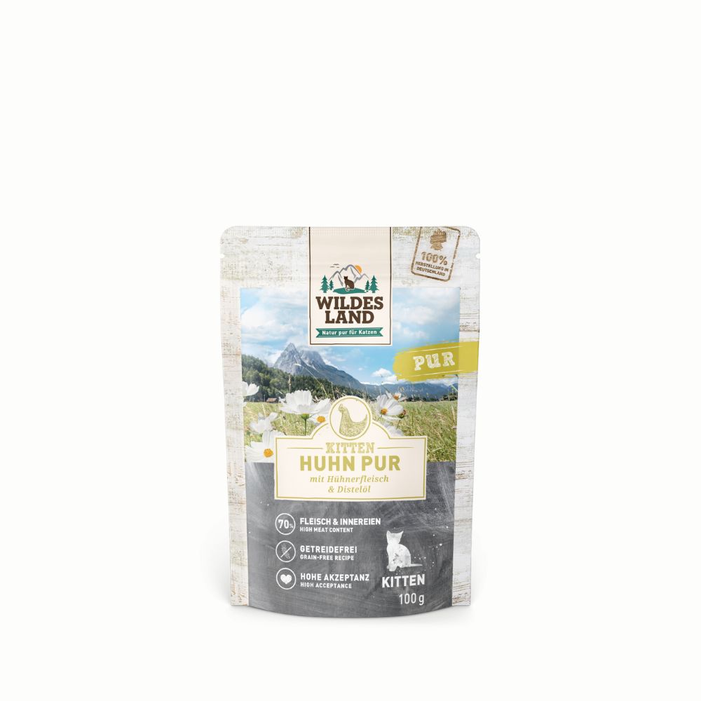 Mit einem Gesamtanteil an Muskelfleisch und Innereien von mehr als 70 % besitzt es eine ausgezeichnete Akzeptanz und Verträglichkeit. Ergänzt wird die Rezeptur nur mit wertvollem Distelöl – kombiniert nach den neuesten wissenschaftlichen Erkenntnissen. Mit dem Wildes Land Nassfutter Kitten Huhn Pur wird Dein Kätzchen mit allen wichtigen Nährstoffen und Vitaminen versorgt, die es im Wachstum benötigt.