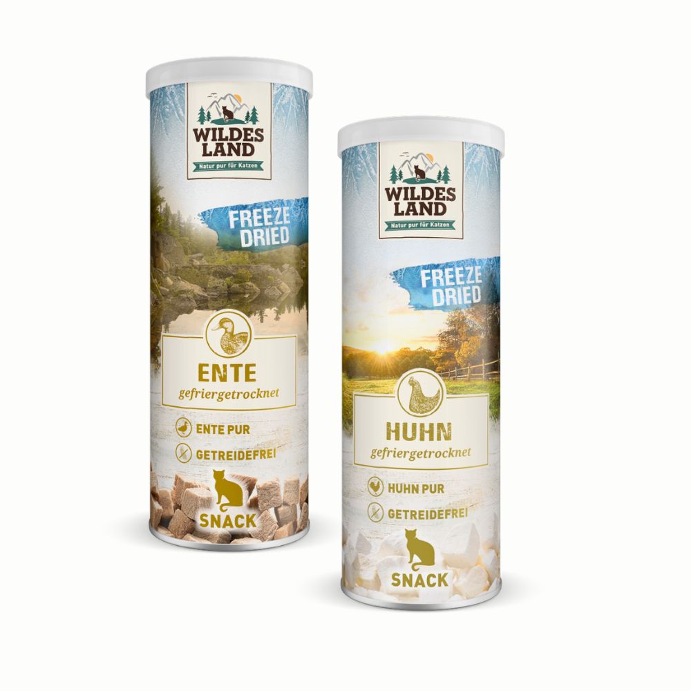 Unser Freeze Dried Snack Huhn besteht zu 99 % aus Hühner- bzw. Entenfleisch. Das Fleisch wird zunächst in Würfelform gebracht und eingefroren. Anschließend wird ihm in einem speziellen Gefriertrocknungsprozess durch Vakuum die Flüssigkeit entzogen. Auf diese Weise bleiben alle Nährstoffe enthalten.